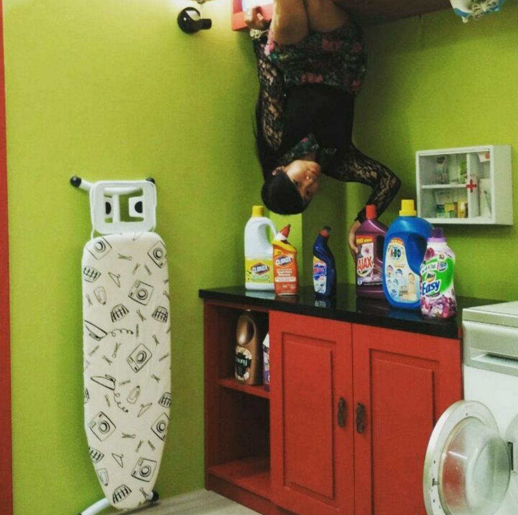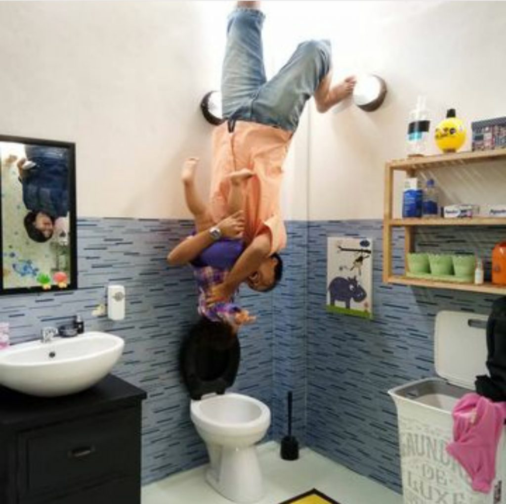 Perlengkapan kamar mandi seperti sabun, shampo, dan perlengkapan lain tertata secara rapi. Dan secara ajaib, mereka menggantung di atap dengan terbalik tanpa tumpah.