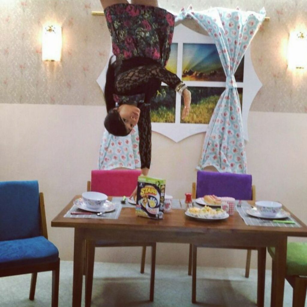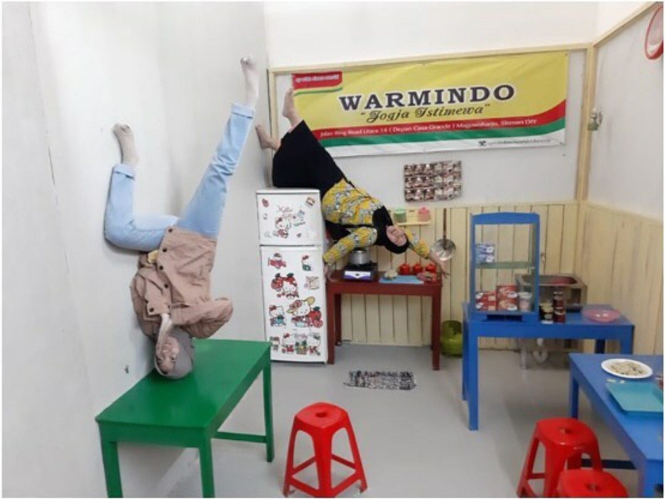 Pengunjung dapat berfoto jungkir balik diantara meja warung. Atau diantara kursi – kursi plastik. Yang lebih unik lagi, minuman sachet yang terpajang tidak jatuh. Bahkan tidak terbalik sedikitpun.