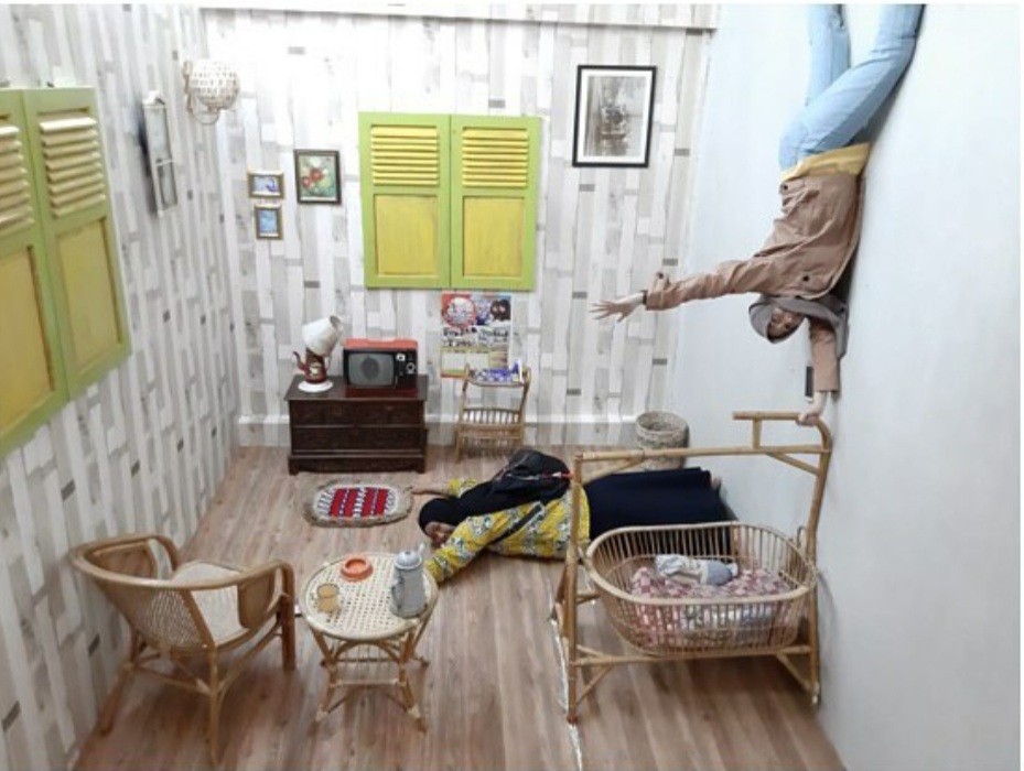 Ada lagi spot foto ruang tamu kuno. Disana terdapat TV jaman dulu, serta tempat tidur bayi. Pengunjung dapat berpose miring memegang tepat tidur bayi.